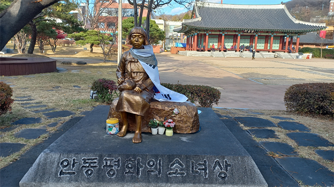 ´ëµ¿·ç¿Í ³²¼ºÀÇ »ó¡ÀÎ °Å¼® Áß°£¿¡ ûµ¿À¸·Î ¸¸µé¾îÁø ‘¾Èµ¿ ÆòÈÀÇ ¼Ò³à»ó’ÀÌ ÀÚ¸®Çϰí ÀÖ´Ù. ÇѺ¹À» ÀÔÀº ´Ü¹ß¸Ó¸® ¼Ò³à»óÀÌ µ¹ À§¿¡ ¾É¾Æ Áö³ ¾ÆÇÄÀÇ ¼¼¿ùÀ» ÀØÁö ¾Ê¾ÒÀ½À» ¸»ÇØÁÖ´Â µíÇÏ´Ù. ÀÏÁ¦ Á¦±¹ÁÖÀÇ ¾Õ¿¡ ¹«ÂüÇÏ°Ô ÀαÇÀÌ ¸»»ìµÈ ¼Ò³àÀÇ »óÀÌ´Ù. ÀϺ»±º¿¡°Ô ‘À§¾ÈºÎ’·Î À¯¸°´çÇÑ ¾ÆÇ ¿ª»ç´Â Àΰ£ÀÇ Á¸¾ö¼ºÀ» ÀÒ¾úÀ¸¸ç ÂøÃë¿Í ¾ï¾ÐÀ¸·Î ÀÌ·ç¾îÁ³´Ù.