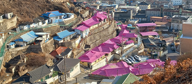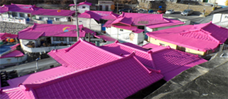 ±Ù·¡¿¡ µé¾î Ä«Æä¸¦ ºñ·ÔÇÏ¿© ¼ºÁø°ñ ´Ù¼öÀÇ ÁÖÅÃÀÌ ºÐÈ«ºû ÁöºØÀ» Çϰí ÀÖ´Ù. ±×µ¿¾È Á¤Ã¼µÇ¾î ÀÖ´ø ¸¶À»¿¡ »ý±â°¡ µ·´Ù. ¸¶À» Àüü°¡ Ä¥À» ÇÑ °ÍÀº ¾Æ´ÏÁö¸¸, SÀÚ ¸ð¾çÀ¸·Î ä»öµÈ ÇÎÅ©ºûÀÇ ¿©·¯ ÁÖÅà ÁöºØµéÀº Ưº°È÷ º½²ÉÀÌ ¸¸¹ßÇÑ µí È»çÇϱ⠱×Áö¾ø´Ù. ¾î¶² ÁýÀÇ ÁöºØ¿¡´Â ¸ÅÈ¿Í º°°ú ´ÞÀÌ ¼ö ³õ¿©ÀÖ´Ù. Àý·Î ¾Æ¸§´Ù¿î ²ÞÀÌ Ã£¾Æµé °Í °°´Ù. ÁöºØÀÌ ÇÎÅ©ºûÀ¸·Î ÅëÀÏµÇ°Ô Ä¥ÇØÁø ÁÖÅõéÀº ¹àÀº ±â¿î°ú Ȱ±âÂù ¿¡³ÊÁö°¡ µé¾îÂ÷´Â ´À³¦ÀÌ´Ù.