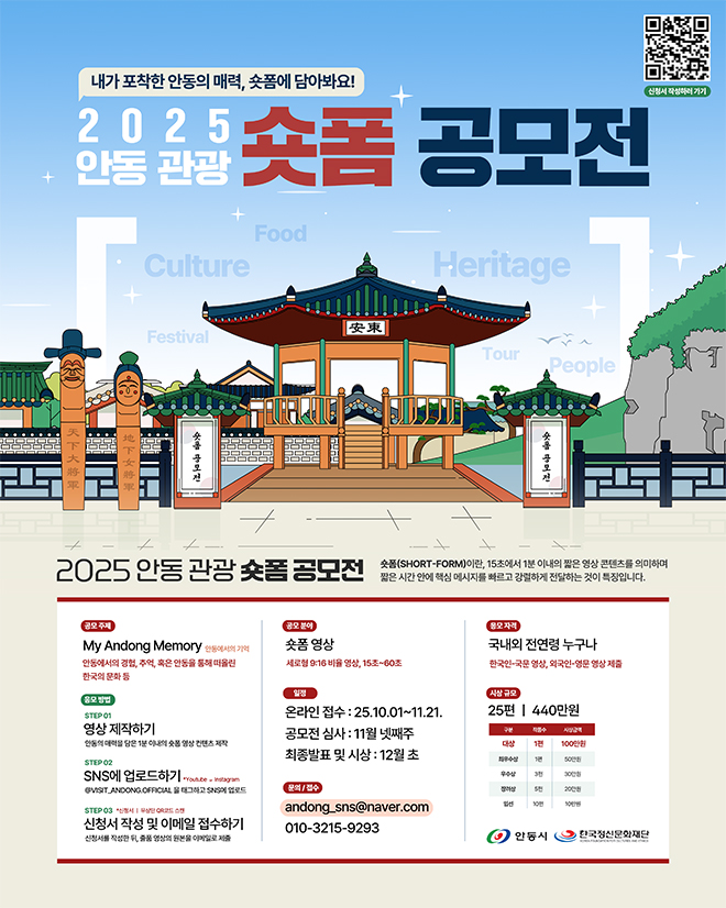 Çѱ¹Á¤½Å¹®ÈÀç´ÜÀº 11¿ù 21ÀϱîÁö 2025 ¾Èµ¿ °ü±¤ ¼ôÆû °ø¸ðÀüÀ» °³ÃÖÇÑ´Ù°í ¹àÇû´Ù. À̹ø °ø¸ðÀüÀº ‘My Andong Memory’¶ó´Â ÁÖÁ¦·Î ¾Èµ¿¿¡¼ÀÇ °æÇè, Ãß¾ï ȤÀº ¾Èµ¿À» ÅëÇØ ¸¸³ Çѱ¹ÀÇ ¹®È¸¦ 1ºÐ À̳»ÀÇ ¼ôÆû(Short-Form) ¿µ»ó ÄÜÅÙÃ÷·Î Á¦ÀÛÇÏ¿© Áö¿øÇÏ¸é µÈ´Ù.