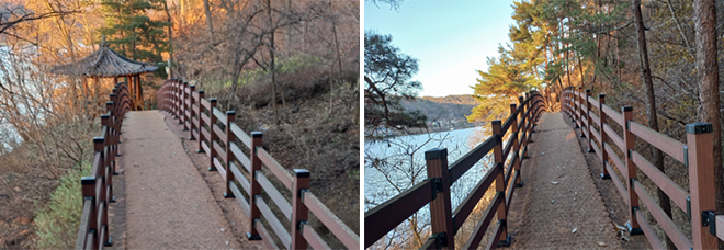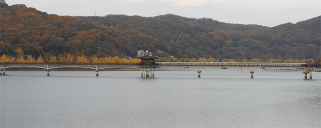 È£¹Ý±æÀ» °È³ë¶ó¸é ½£¼ÓÀÇ ¿À¼Ö±æÀ» °È°í ÀÖ´Ù´Â Âø°¢¿¡ ºüÁø´Ù. ½£¿¡¼ ³¯¾Æµå´Â ¸¶¸¥ ³ª¹µÀÙÀÇ Ã¤Ã븦 µéÀÌ۸ç È£¼ö À§·Î ´«±æÀ» ÁØ´Ù. ȲÆ÷µÀ¹è°¡ ÇѶ§ÀÇ ¼Õ´ÔµéÀ» Å¿ì°í ¿ù¿µ±³ ¾Æ·¡¸¦ À¯À¯È÷ Áö³ªÄ£´Ù. ȲÅä·Î ¹°µéÀÎ µÀÀÌ ¾Èµ¿È£¸¦ ´©ºô ¶§¸é ¿¾ ¸ÚÀÇ Á¤Ãë°¡ Àý·Î ¿ì·¯³ª¿Â´Ù. ¾Æ´ãÇÑ ÁÖº¯ °æ°üÀ» °ü¸ÁÇϴ ȲÆ÷µÀ¹è´Â È£¼ö À§¸¦ À¯¿µÇÑ´Ù. Ưº°È÷ ¹ã¿¡´Â ¹® º¸Æ®°¡ ¾îµÒÀ» ¹àÈ÷¸ç ¹°¼ÓÀÇ ´Þ°ú ÇÔ²² ¹Ý´Þ ¹èÀÇ Á¤Ã븦 ´À³¢°Ô ÇÑ´Ù. °¡·Îµî ºÒºûÀÇ È£¹Ý±æ°ú È£¼ö À§ÀÇ ¹® º¸Æ®´Â ÀºÀºÇÑ Á¤°¨À» ºÒ·¯³»±â¿¡ ±×¸¸ÀÌ´Ù.