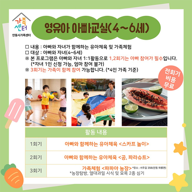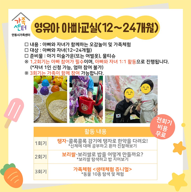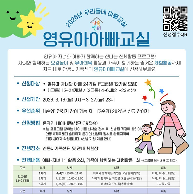 ‘2026³â ¿ì¸®µ¿³× ¾Æºü±³½Ç, ¿µÀ¯¾Æ ¾Æºü±³½Ç ÇÁ·Î±×·¥’Àº ¿µÀ¯¾Æ ÀÚ³à¿Í ¾Æºü°¡ ÇÔ²²ÇÏ´Â ½Å³ª´Â ½ÅüȰµ¿À̸ç ÀÚ³à¿Í ÇÔ²²ÇÏ´Â ¿À°¨ ³îÀÌ ¹× À¯¾ÆÃ¼À° Ȱµ¿°ú °¡Á·ÀÌ ÇÔ²²ÇÏ´Â Áñ°Å¿î üÇèȰµ¿À¸·Î ±¸¼ºµÇ¾î ÀÖ´Ù. ÁøÇàÀå¼Ò´Â ¾Èµ¿½Ã°¡Á·¼¾ÅÍ ¹× °ü³» üÇèÀåÀ̸ç, ÁøÇà ³»¿ëÀº ¾Æºü-ÀÚ³à 1:1 Ȱµ¿ 2ȸ, °¡Á·ÀÌ ÇÔ²²Çϴ üÇèȰµ¿ 1ȸ·Î ±¸¼ºµÇ¾î ÀÖ´Ù.