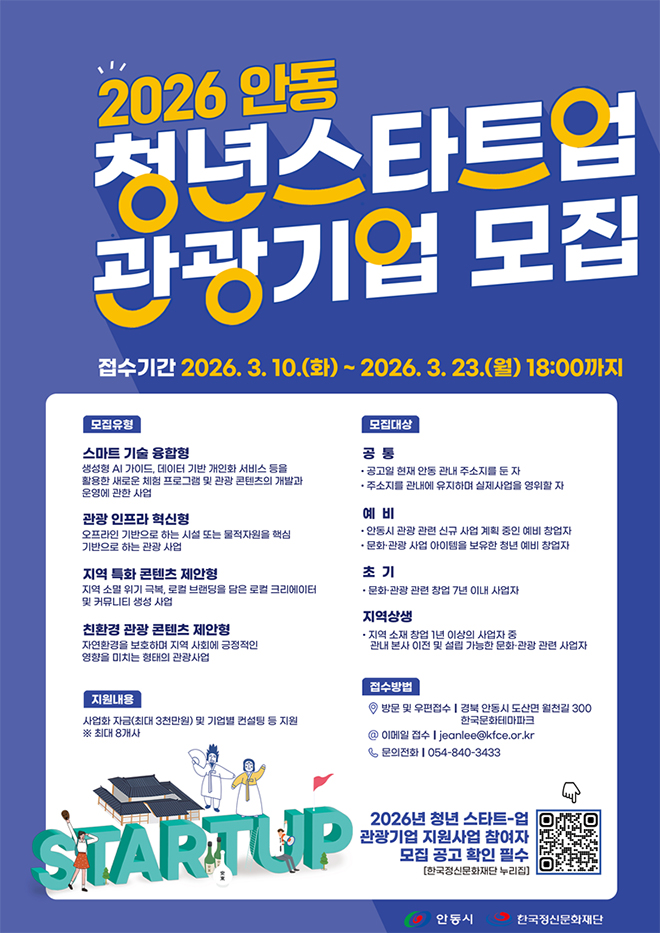 ¾Èµ¿½Ã¿Í (Àç)Çѱ¹Á¤½Å¹®ÈÀç´ÜÀº ‘2026³â û³â ½ºÅ¸Æ®¾÷ °ü±¤±â¾÷’ »ç¾÷ÀÚ¿Í ¿¹ºñ â¾÷ÀÚ¸¦ °ø°³ ¸ðÁýÇß´Ù. À̹ø »ç¾÷Àº û³âµéÀÇ Âü½ÅÇÑ °ü±¤ ¾ÆÀ̵ð¾î¸¦ ¹ß±¼ÇÏ°í ¹Î°£ Áß½ÉÀÇ °ü±¤ »ýŰ踦 Á¶¼ºÇØ Áö¿ª °ü±¤»ê¾÷À» Ȱ¼ºÈÇϱâ À§ÇØ ¸¶·ÃµÇ¾î ÃÑ 17ÆÀÀÌ Á¢¼öÇÏ¿´´Ù.
