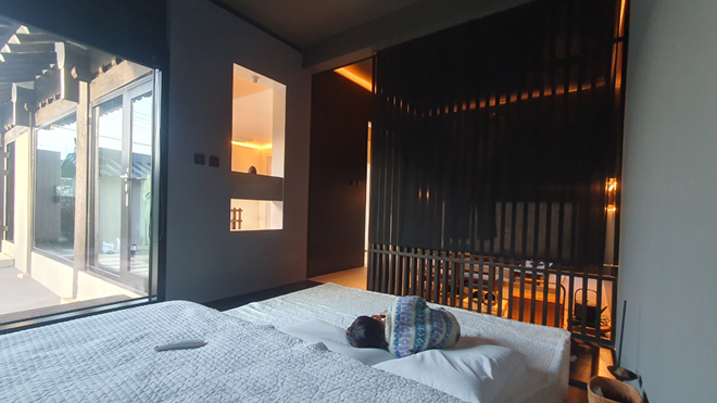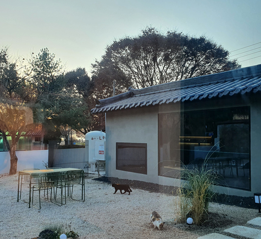 ÀÌ À¯¸®Ã¢À» ¹ÝÂë °¡¸®°í ÀÖ´Â ¹ÝÅõ¸íÇÑ ·ç¹ö°¡ ÀλóÀûÀÌ´Ù. ·ç¹ö´Â ¿ÜºÎ·ÎºÎÅÍÀÇ ½Ã¼±°ú ÇÞºûÀ» Â÷´ÜÇϸ鼵µ ³»ºÎ¿¡ ÀÖ´Â »ç¿ëÀÚ°¡ ¹Ù±ùÀÇ °æÄ¡¸¦ °¨»óÇϱâ À§ÇØ ¼³Ä¡ÇÏ´Â °ÍÀε¥, ÇÑ¿Á¿¡ ÀÌÁú°¨À» ÁÖÁö ¾Êµµ·Ï °ÝÀÚ¹«´ÌÀÇ ¹®Æ²¿¡ ÇÑÁöÀÇ ´À³¦ÀÌ ³ª´Â âȣÁö¸¦ »ç¿ëÇß´Ù. ¶Ç ¿·À¸·Î º¸À̴ â¹®À¸·Î´Â ´ë³ª¹«·Î Á¶°æÀ» ¼³Ä¡ÇÏ¿© ÀÛÁö¸¸ ÀÚ¿¬°ú ÇÔ²² ¾î¿ì·¯Áö´Â ´À³¦ÀÌ µé±âµµ ÇÑ´Ù. »ç¿ëÀÚ°¡ ÀÚ¿¬°ú ÇÑ¿Á¿¡ ±×´ë·Î ½º¸çµé°Ô °ÇÃàÇÑ Á¡ÀÌ °¨Åº½º·¯¿ï Á¤µµ·Î »©¾î³µ´Ù. ¼÷¼Ò Àüü°¡ °Å´ëÇÑ °¶·¯¸®ÀÌÀÚ ÇϳªÀÇ °ÇÃà ÀÛǰó·³ ´À²¸Áö±âµµ ÇÑ´Ù.