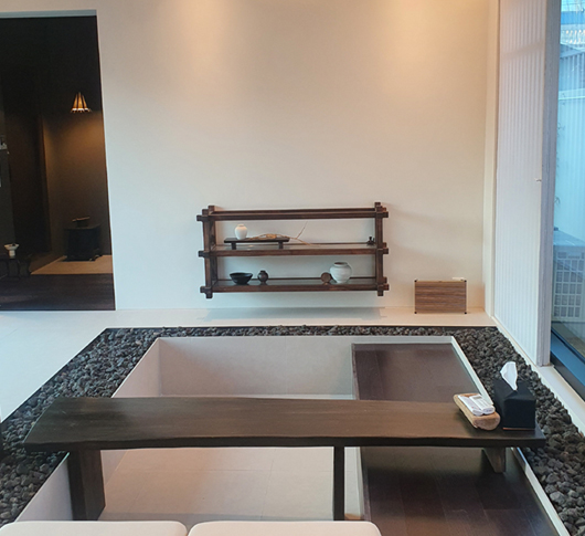 Èñ°ÔÀÇ ½ÄŹÀº ƯÀÌÇÏ°Ô ¹Ù´ÚÀ» ¶Õ¾î ÀϺ»½Äó·³ ´Ù¸®°¡ ¾Æ·¡·Î µé¾î°¡´Â ±¸Á¶¿´´Ù. È£½ºÆ®¿¡°Ô ¹°¾îº¸´Ï ¿ø·¡ ÀÖ´ø ÁýÀ» ¸®¸ðµ¨¸µ ÇÑ °ÍÀε¥, ºÎ¾ý ¿· ¾Æ±ÃÀ̰¡ ÀÖ´ø À§Ä¡¿¡ ´ÜÂ÷°¡ ÀÖ´ø °ÍÀ» ÄÜÅ©¸®Æ®·Î µ¤¾î¹ö¸®Áö ¾Ê°í ½ÄŹÀ̶ó´Â ¾ÆÀ̵ð¾î·Î Â÷¿ëÇÑ °ÍÀ̶ó ÇÑ´Ù.